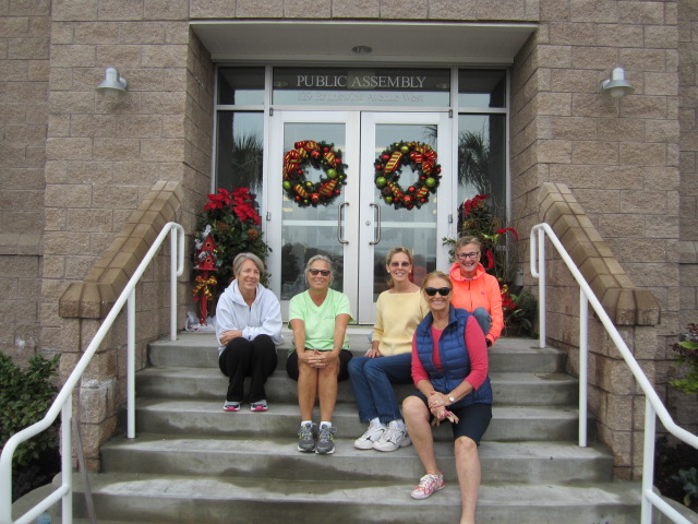 Seasonal Decorations Committee members Karen Fleischhauer, Cecelia Weston (chair), Donna Aycock and Connie Jo Boyte join President Gayle Todd on the Town Hall steps.