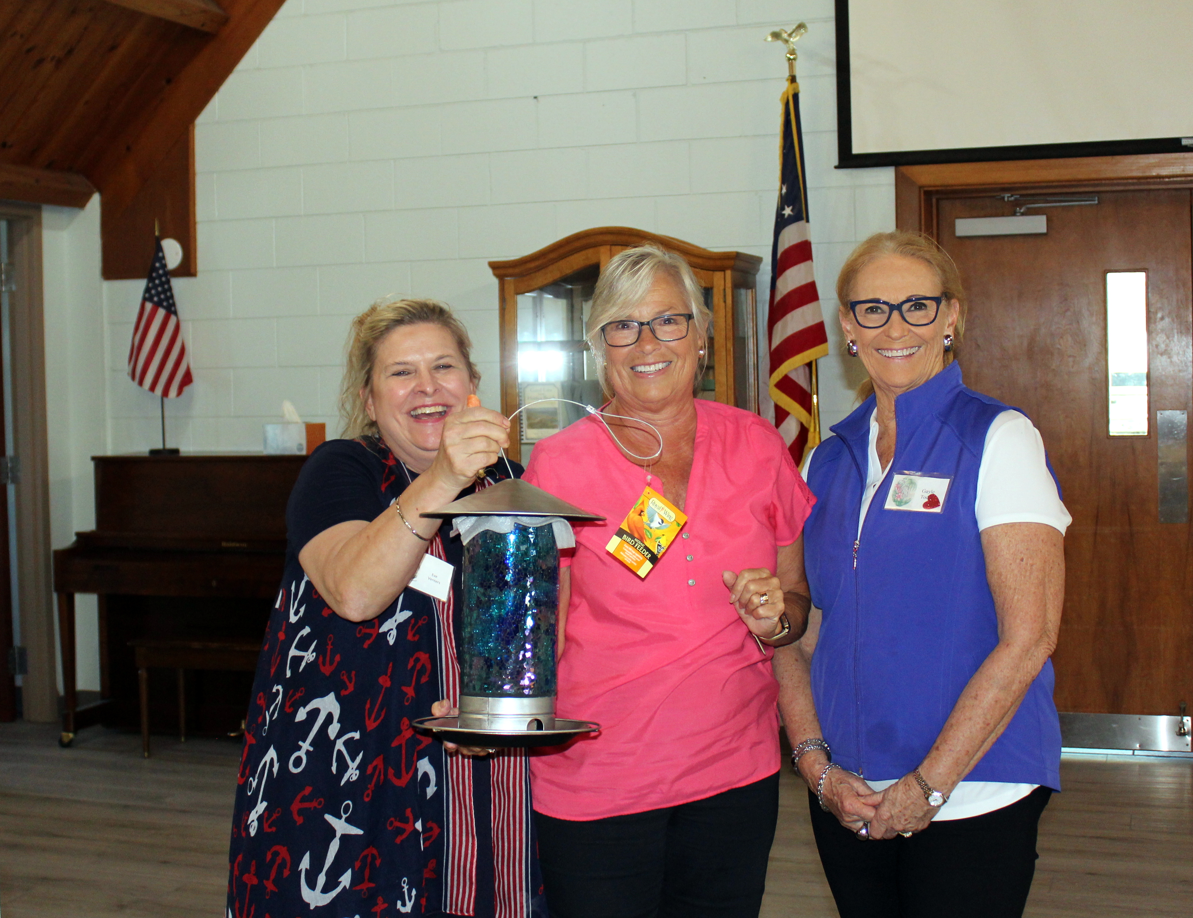 Eve Venters is presented with a bird feeder in appreciation of leading the program by Second Vice President Cecelia Weston and President Gayle Todd.