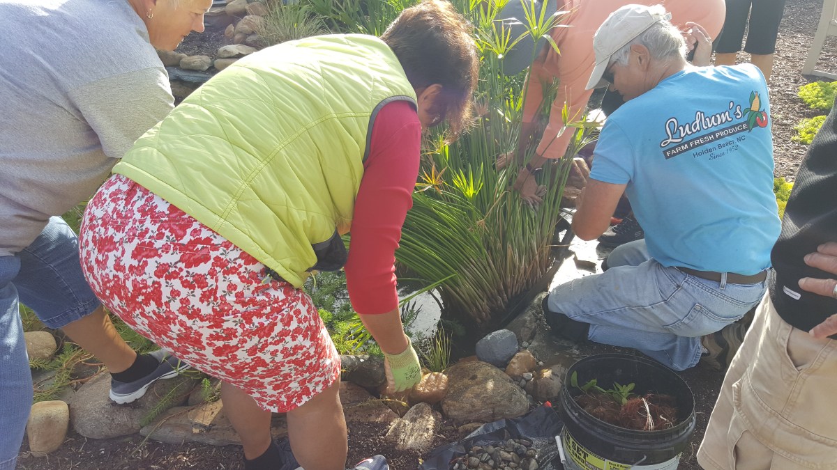 20191024_092912 Oct25 Published at 5312 × 2988 in Fall Planting ← Previous Next → Becky Greene, Ros Stokes, and Tim Gibble remove overgrown plants from the waterfall.