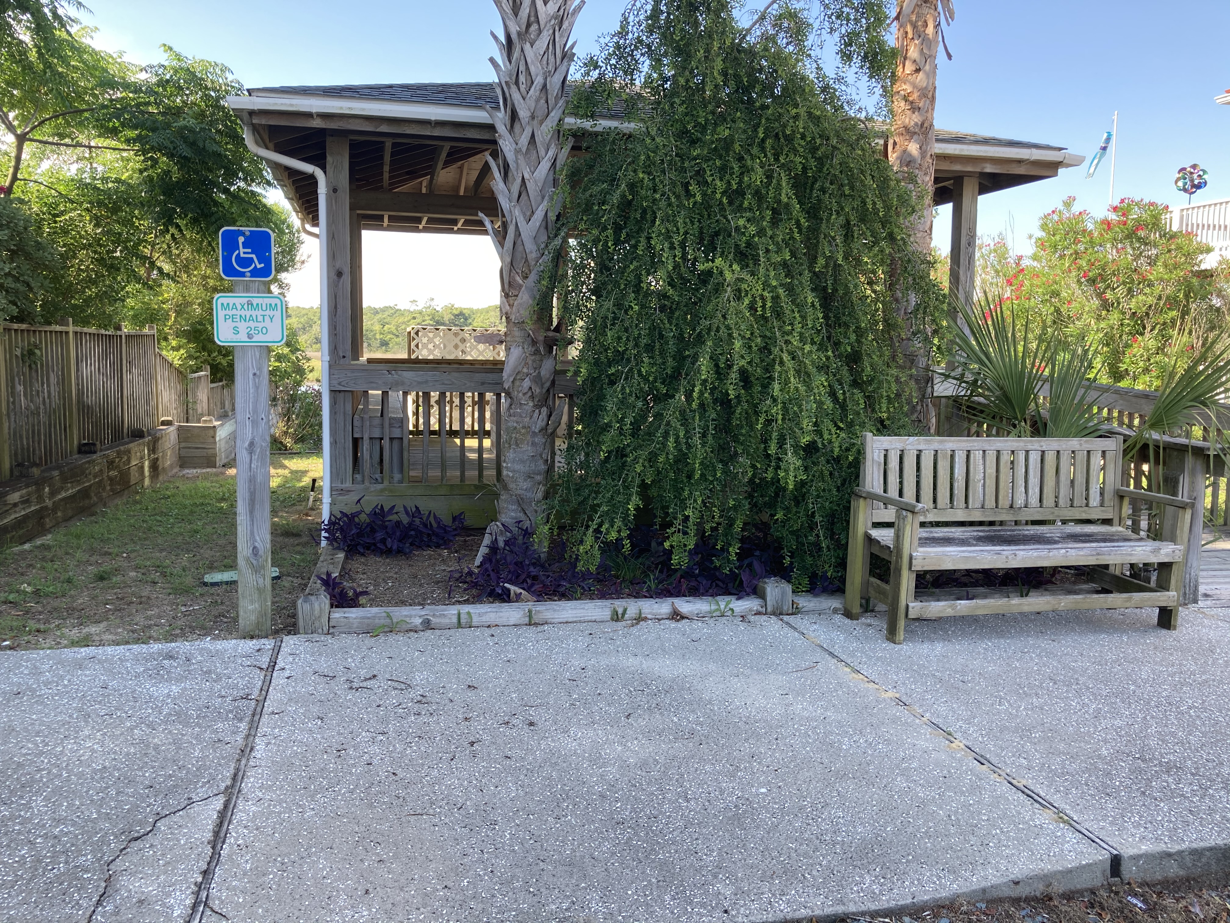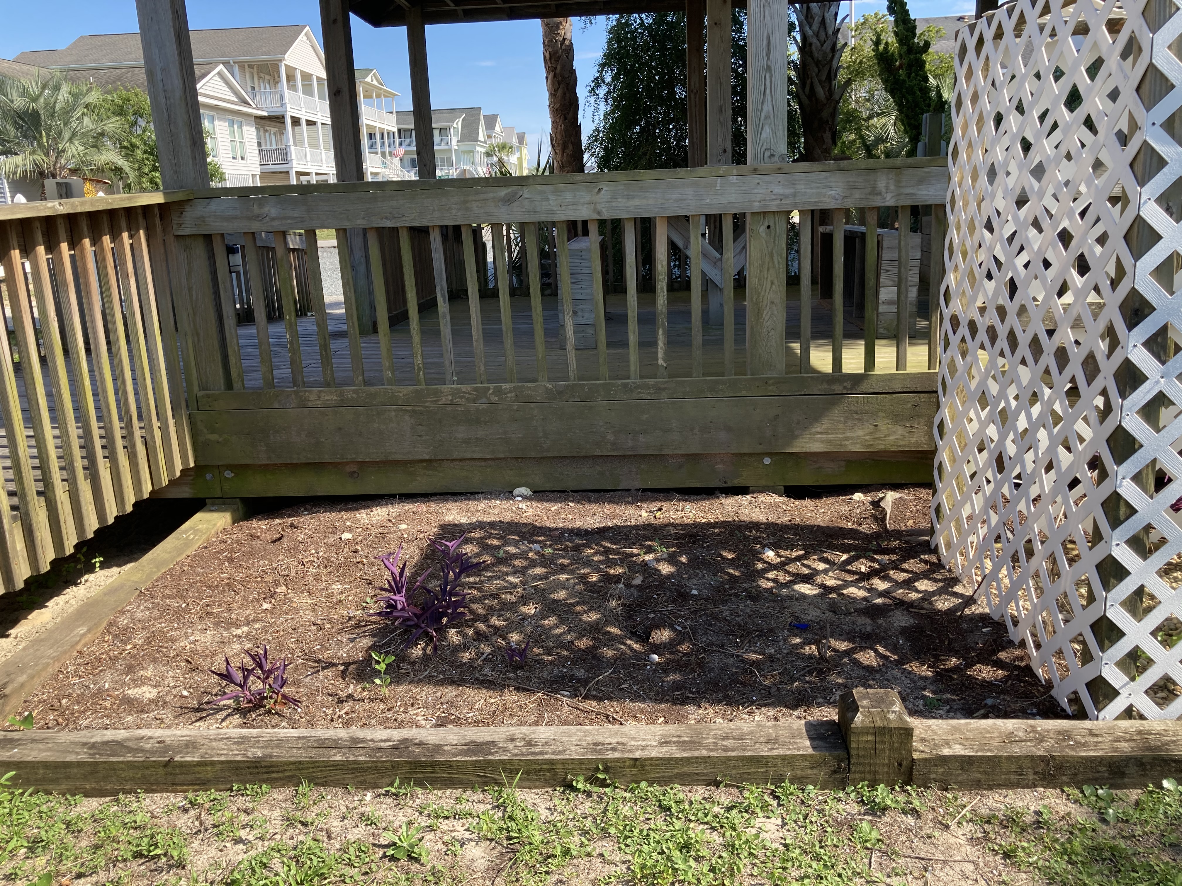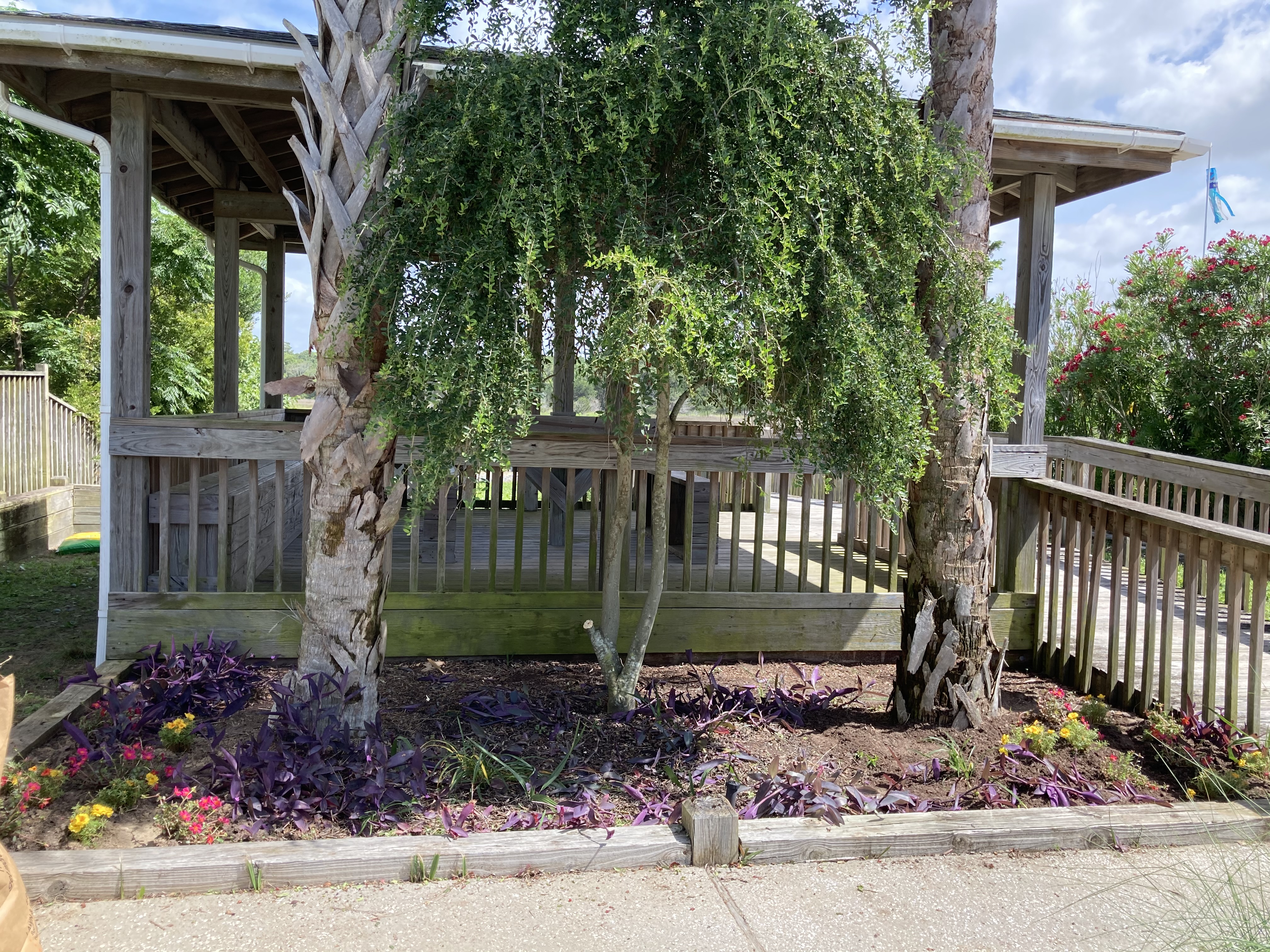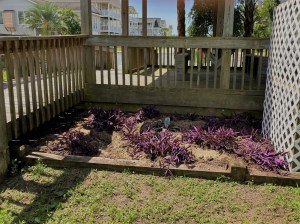 For the front flowerbed, the overgrown tree was trimmed up to allow breezes through to the picnic area. Additional Purple Queen plant was transplanted and a few more perennials and annuals were added for color. A volunteer palm was transplanted to a more appropriate spot.