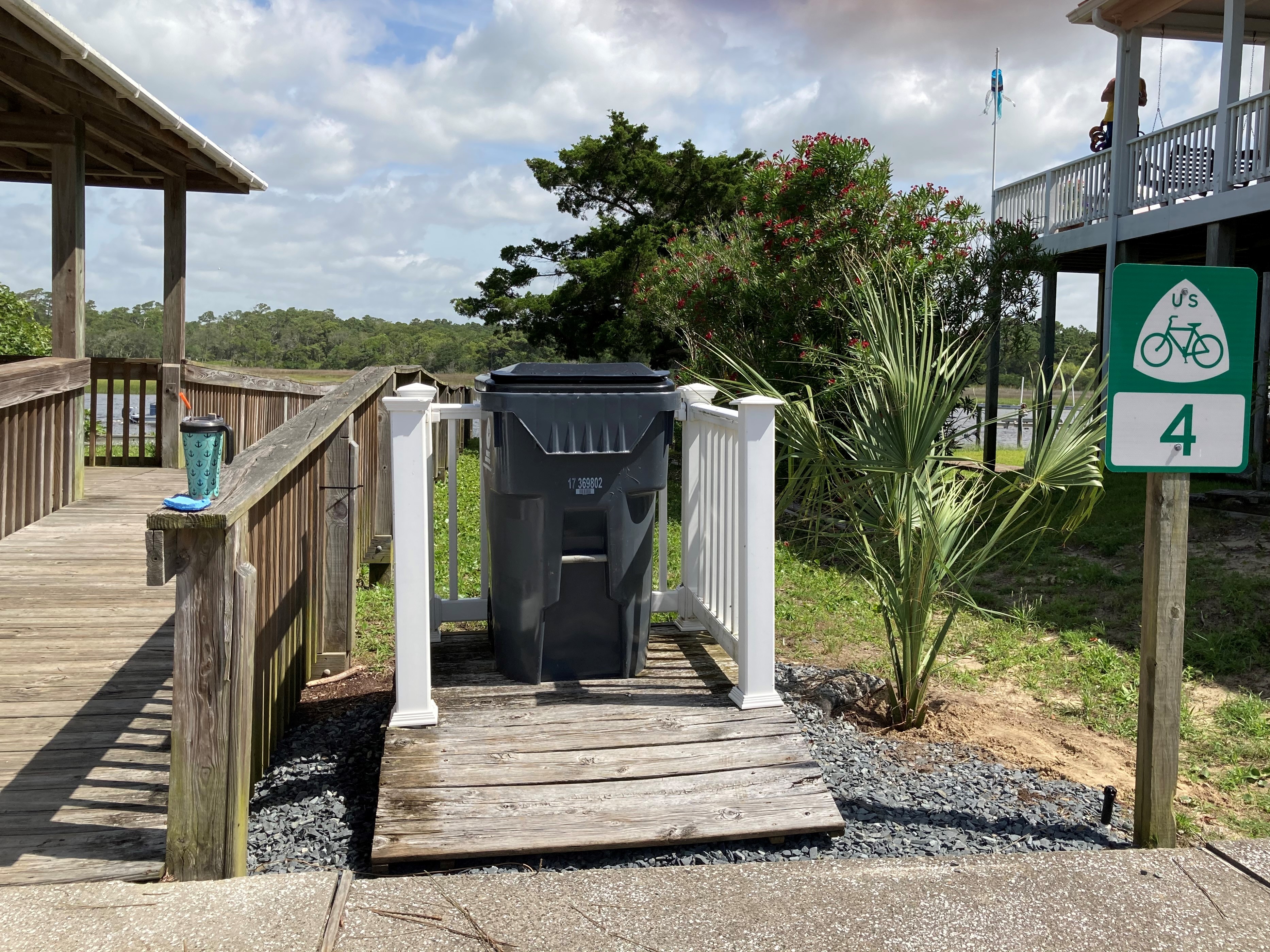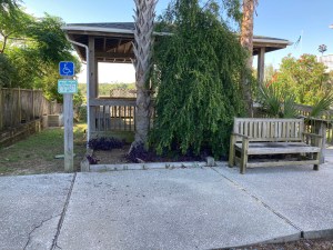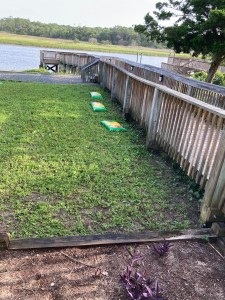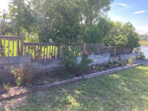 Beside the walkway going to the dock, four new shrubs were planted to provide interest. The Landscaping Committee chose Bottle Brush shrubs for this spot. This plant is drought tolerant and blooms several times each year with red blooms that look like bottle brushes. The blooms are favorites of butterflies, honey bees, and other pollinators.