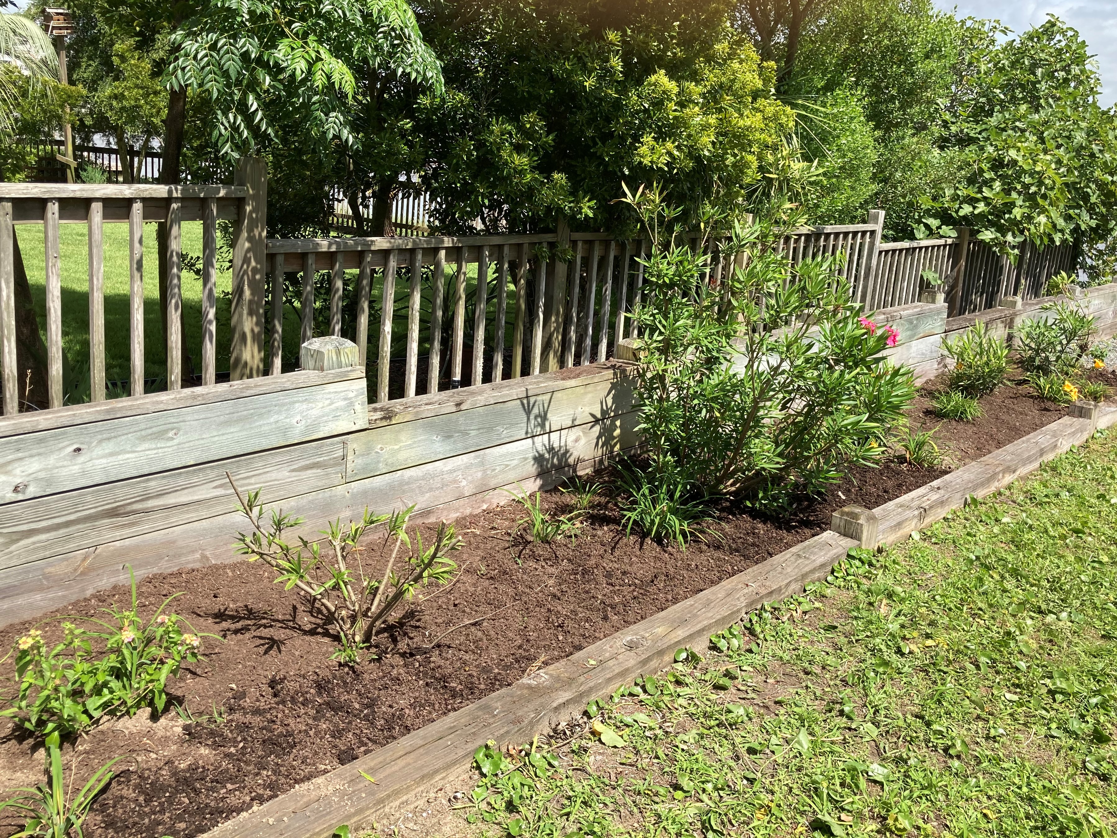 This side bed was cleaned and the vegetation was pruned of damaged areas. Additional Oleanders and perennials were added for color.